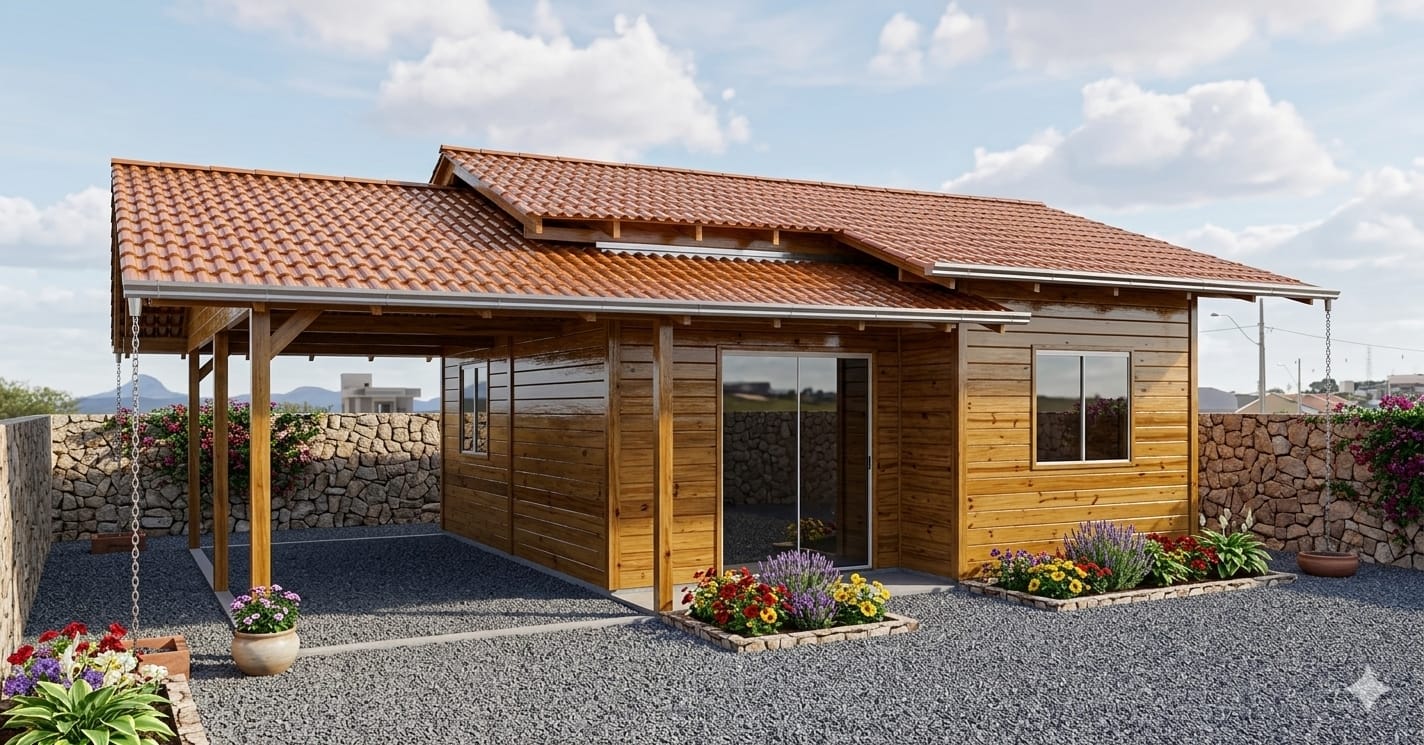 Um projeto pensado para quem precisa de uma garagem laterial e um varandão frontal. Vem conversar com a gente. Personalizamos o tamanho de acordo com sua necessidade.